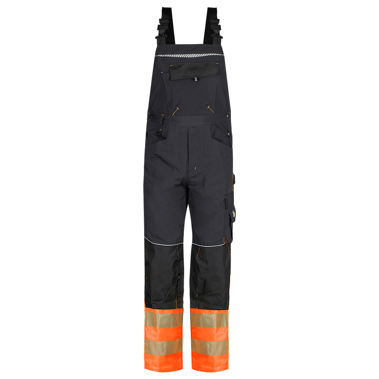 Salopetă de lucru cu buzunare funcționale și genunchi întăriți, benzi reflectorizante și elemente de semnalizare • două buzunare laterale, • două buzunare la spate – cel drept cu husa, • un buzunar stâng la șold cu clapă și un buzunar pentru telefon mobil, • un buzunar cu clapă pe placa pieptului, • genunchi întăriți cu buzunar pentru genunchiere, • elastic în talie, • bretele elastice, reglabile, • elemente reflectorizante. Material: 35% bumbac/65% polyester, 270 g/m²