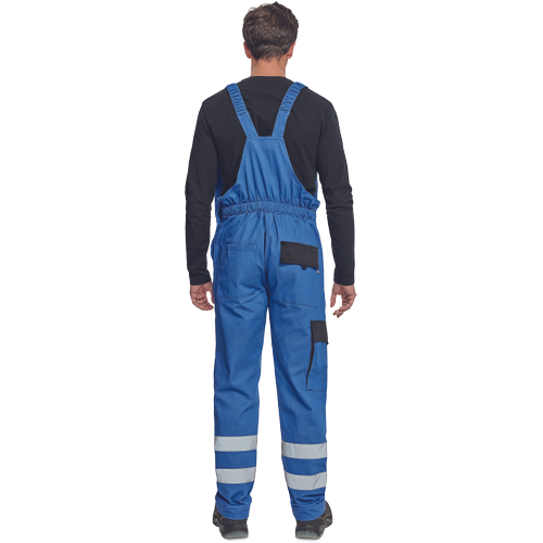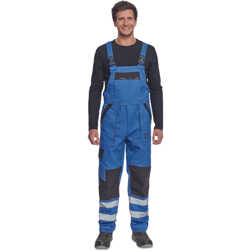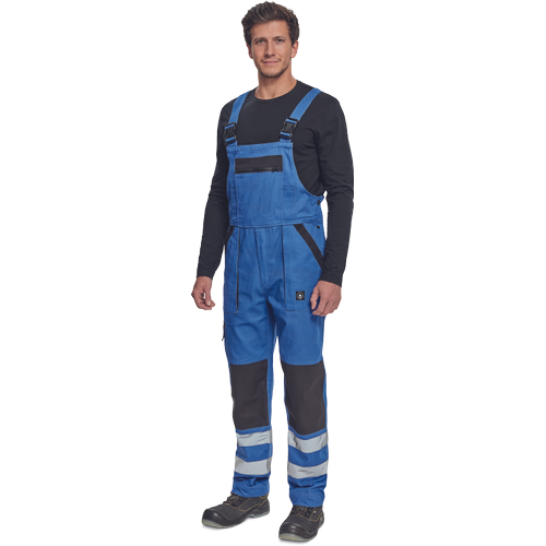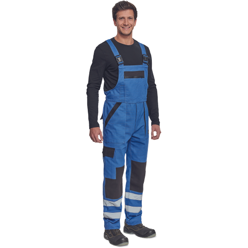 salopeta cu pieptar de lucru pentru barbati cu talie elastica bretele late prevazute cu catarame din plastic, 2 buzunare laterale, 1 buzunar lateral pe picior, 1 buzunar mare la piept, 2 buzunare la spate benzi reflectorizante pe partile inferioare ale piciorului intarituri la genunchi