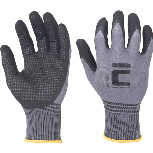 Materiale:Material de imersare: nitril, foam, nitril Materialul manusilor: poliamida nailon, Spandex Material manseta: poliamida nailon, Spandex Descriere: seamless glove from nylon and spandex with special foam nitrile dipping ensuring a long durability superb grip in dry and oily conditions touch screen friendly breathability by 30 less energy and by 63 less CO2 emisison in the production process in comparison to regular seamless gloves dipped in nitrile extraordinary protection against abrasion, lasts more than 19.500 cycles 15 GG nitrile dots on a palm and fingers to increase grip Standarde: EN 407X1XXXX EN 3884121A EN 420Caracteristici: Zona de imersie: palma, degete A doua zona de imersie: degete, palma Masura: 15 gg