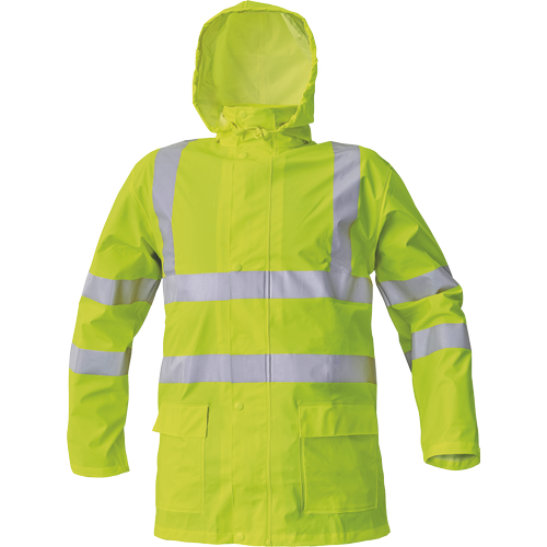 Materiale:Strat superior exterior imbracaminte: 100 poliester, 200 gm, Strat: polyurethane, tlouka 0,5 mm Descriere: set complet, impermeabil si rezistent la vant haina de ploaie , cu gluga integrata in guler si pantaloni cu talie elastica material moale, care nu fasaie 2 buzunare frontale incapatoare, cu clape de protectie care impiedica patrunderea apei maneci ajustabile cu capse Standarde: EN ISO 13688 EN ISO 20471Class: 3 EN 34331XCaracteristici: Caracteristici: rezistenta la apa, respirabil, imbracaminte de avertizare de inalta vizibilitate pentru uz profesional Coloana de apa: 3000 mm
