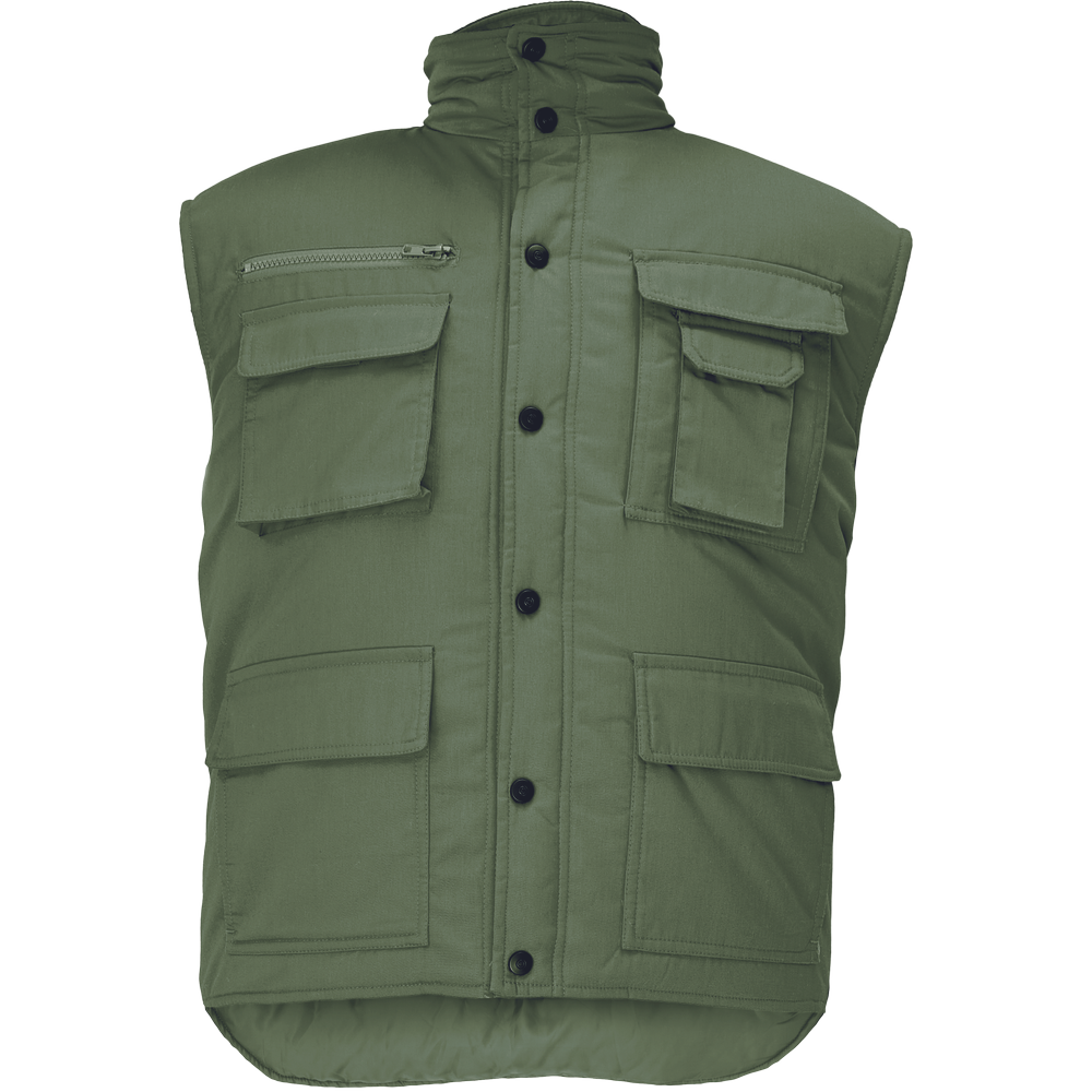 Materiale:Strat superior exterior imbracaminte: 100 poliester, 135 gm Captuseala interior imbracaminte: 100 poliester Descriere: vesta termoizolanta cu guler inalt partea din spate mai lunga Inchidere cu capse de plastic Standarde: EN ISO 13688