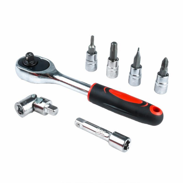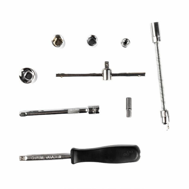 13 buc. prize 1/4”: 4; 4,5; 5; 5,5; 6; 7; 8; 9; 10; 11; 12; 13; 14 mm; 6 bucati de surubelnita TORX : T10; T15; T20; T25; T30; T40; 6 bucati surubelnite hexagonale : 3; 4; 5; 6; 7; 8mm; 3 bucati de surubelnita Phillips Phillips: Ph1; Ph2; Ph3; 3 bucati de surubelnita in cruce Pozidriv: Pz1; Pz2; Pz3; 3 buc Biti plate de surubelnita: 4; 5,5; 7mm; 2 buc Extensii 1/4”: 50; 100 mm; 1 buc clichet 1/4” : 150 mm; 1 buc. Buton surubelnita 1/4”, 150 mm; 1 buc. Buton glisant 1/4” , 115 mm; 1 buc. Extensie flexibila 1/4” , 150 mm; 1 buc articulatie universala 1/4”; 1 buc Adaptor varf; 4 buc chei hexagonale 1,27 ; 1,5; 2; 2.5