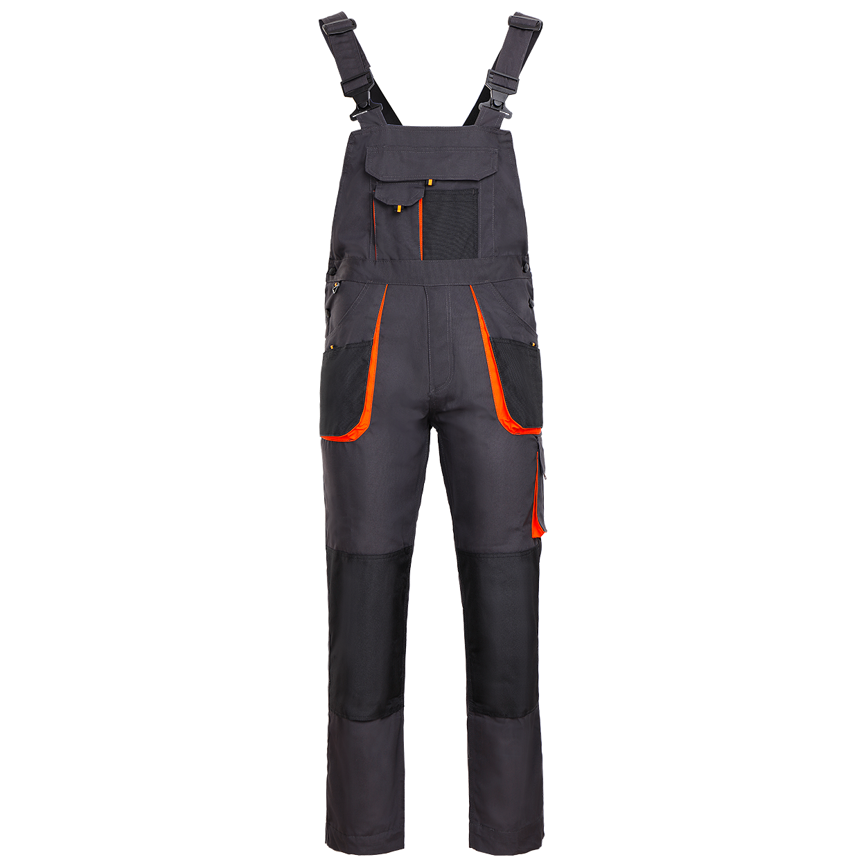 Salopetă de lucru funcțională. • croială dreaptă, liberă, • închidere laterală cu nasturi, • două buzunare frontale și un buzunar pentru telefonul mobil, • două buzunare la spate cu husa și velcro, • un buzunar pe coapsa stângă cu clapetă și velcro, • două buzunare la piept • inel de ciocan, • bretele reglabile, • genunchi intariți cu buzunar pentru genunchiere, • elastic parțial în talie, Material: 65% poliester/35% bumbac, 260 g/m²