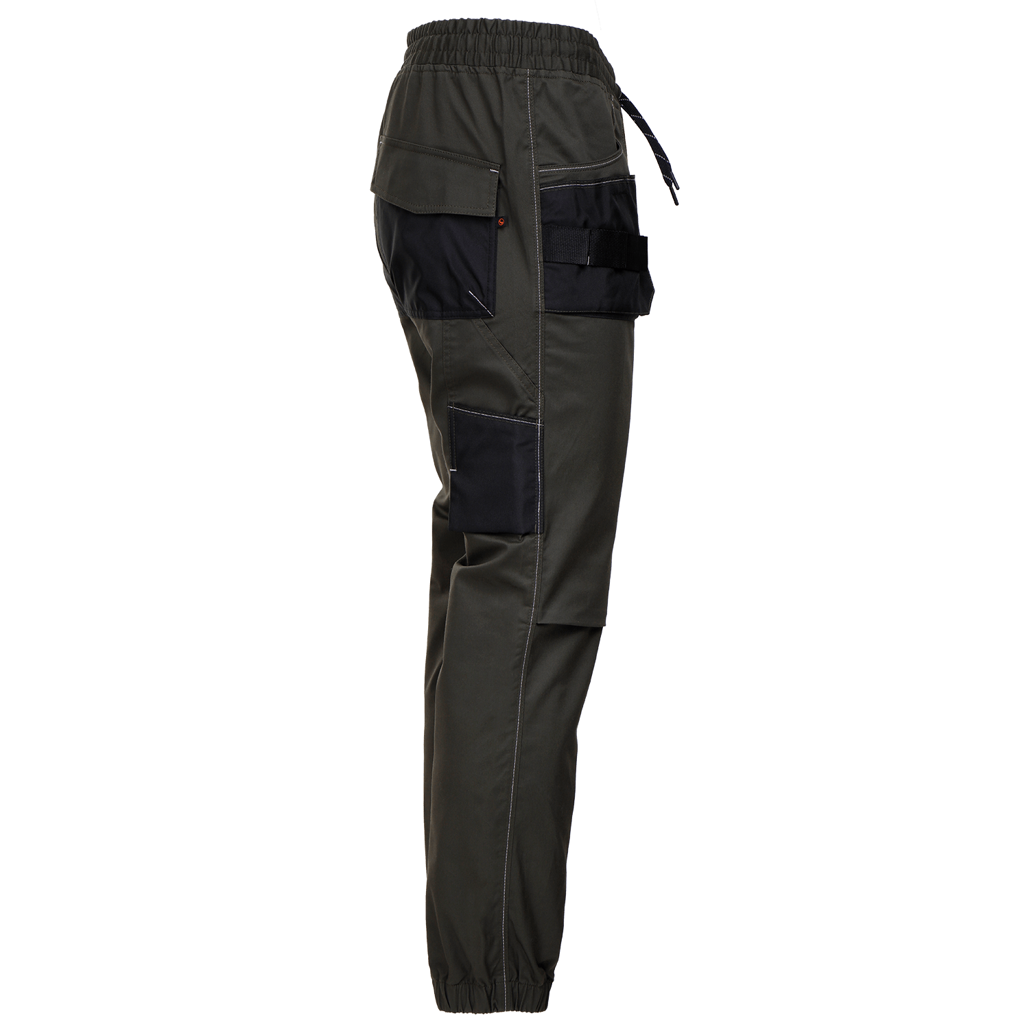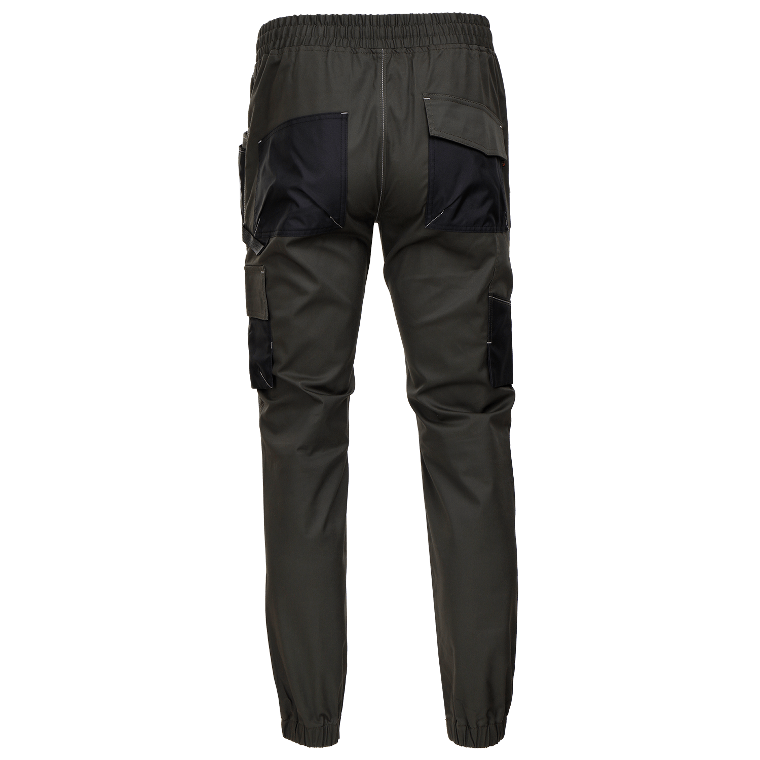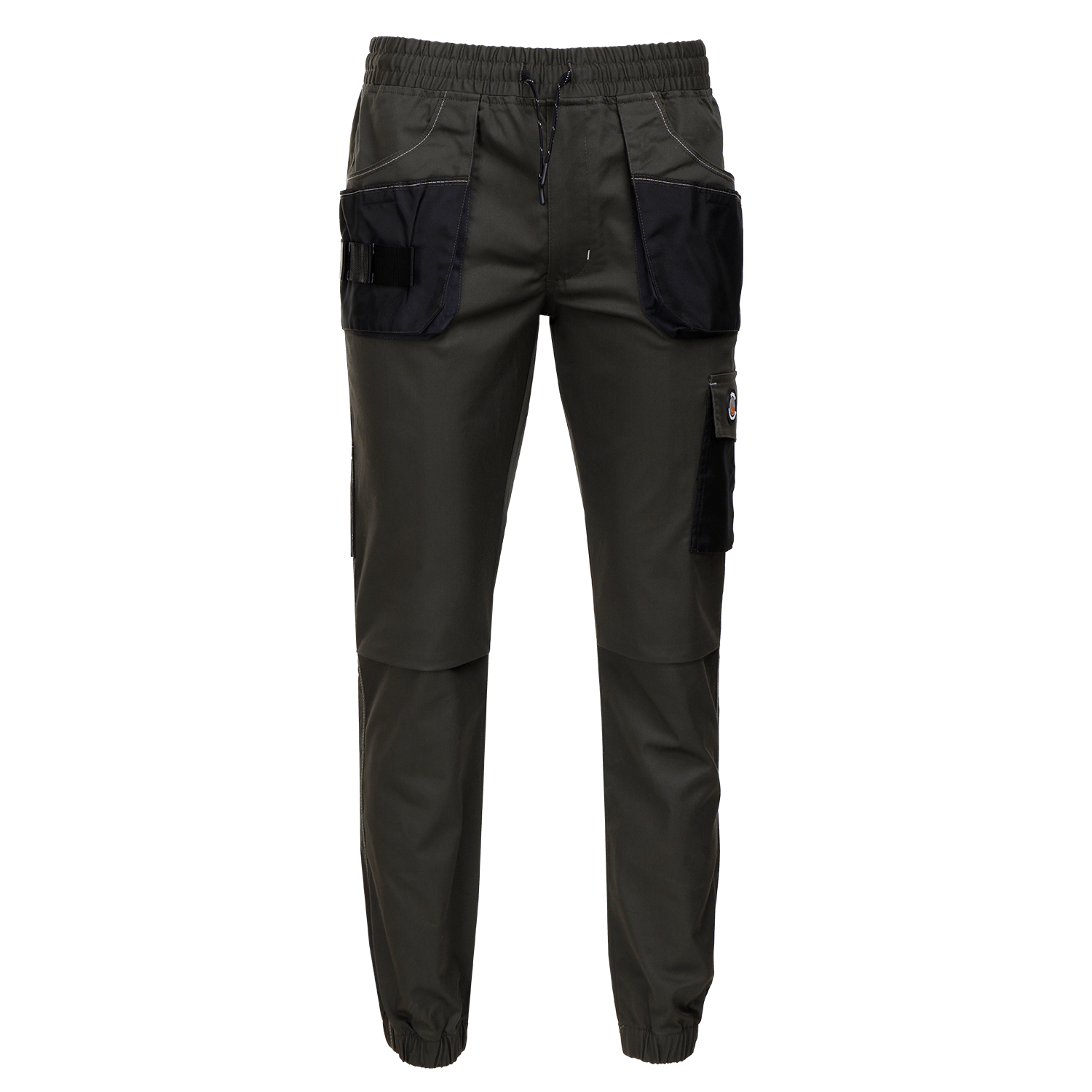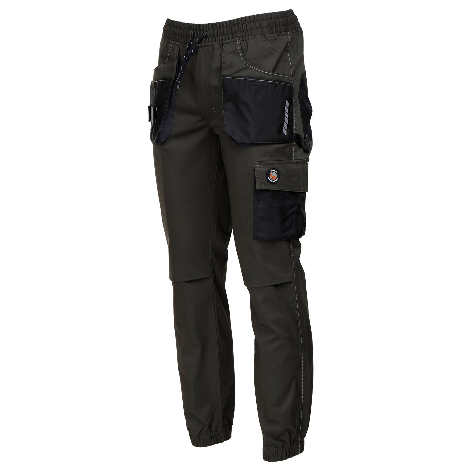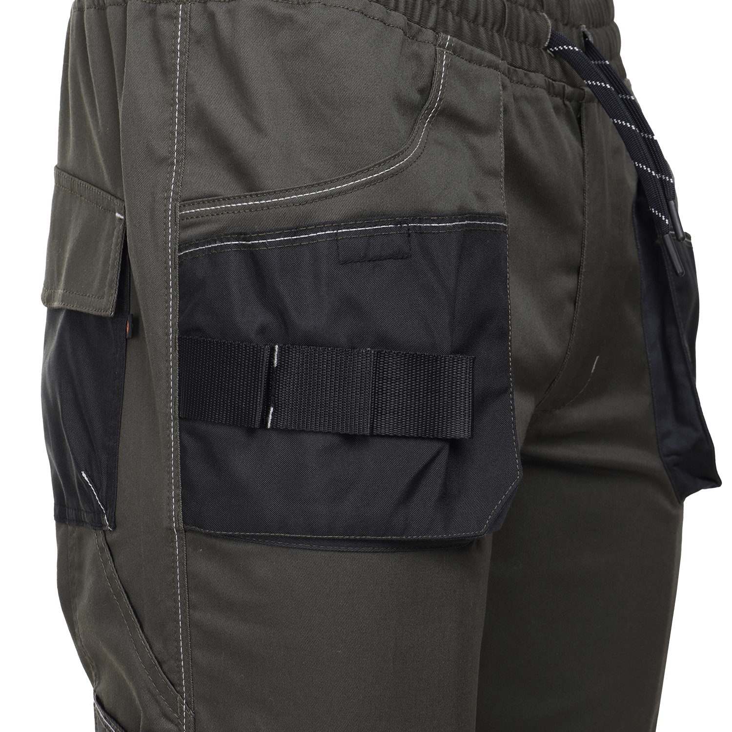 • pantaloni de lucru cu aspect sportiv și croi mulat, • talie elastică, șireturi și fermoar pentru confort maxim, • două buzunare frontale voluminoase și buzunare suplimentare pe ele, • un buzunar cu clapeta pe coapsa stângă, • buzunar pentru scule pe coapsa dreaptă, • două buzunare la spate – cel drept cu clapeta, • prindere elastică în glezne, • element reflectorizant pe buzunarul din stânga din față. MATERIAL: 32% bumbac, 65% poliester, 3% spandex, 240 g/m²